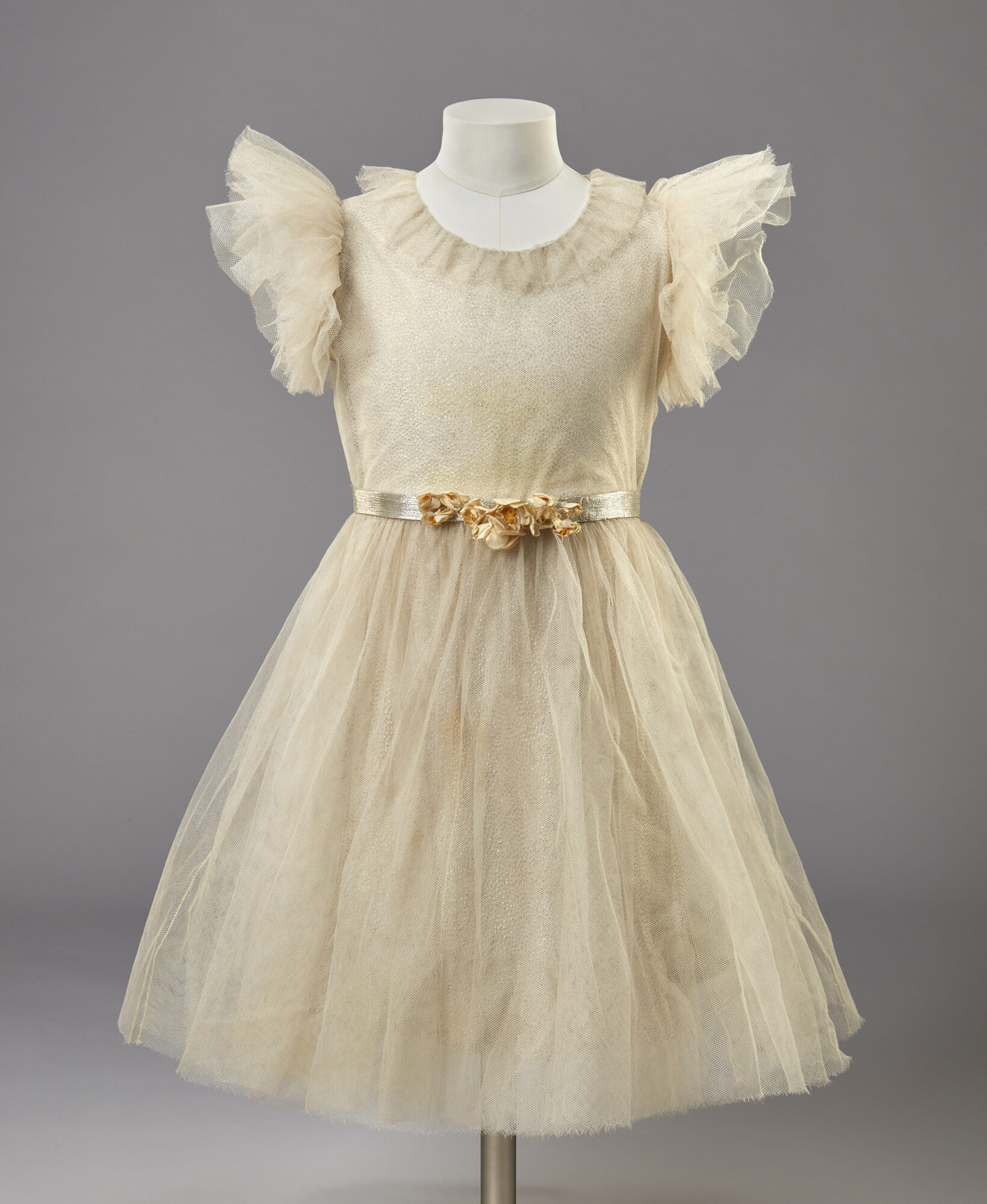 Brudepike: Denne sølvskimrende brudepikekjolen i lamé og tyll, designet av Edward Molyneux i 1934, er det eldste bevarte coutureplagget som tilhørte den fremtidige Queen Elizabeth II. Hun bar kjolen som åtteåring i bryllupet til sin onkel, hertugen av Kent. Foto: © Royal Collection Enterprises Limited 2025 | Royal Collection Trust
