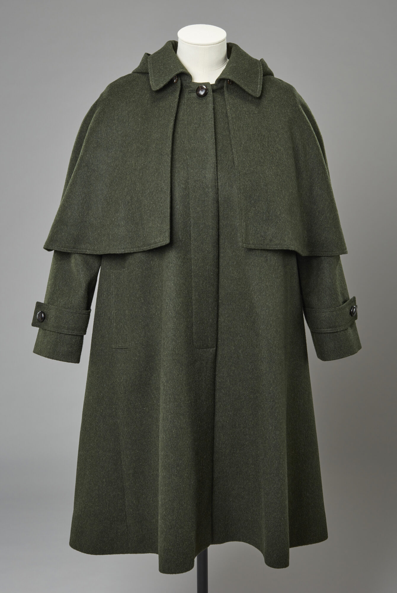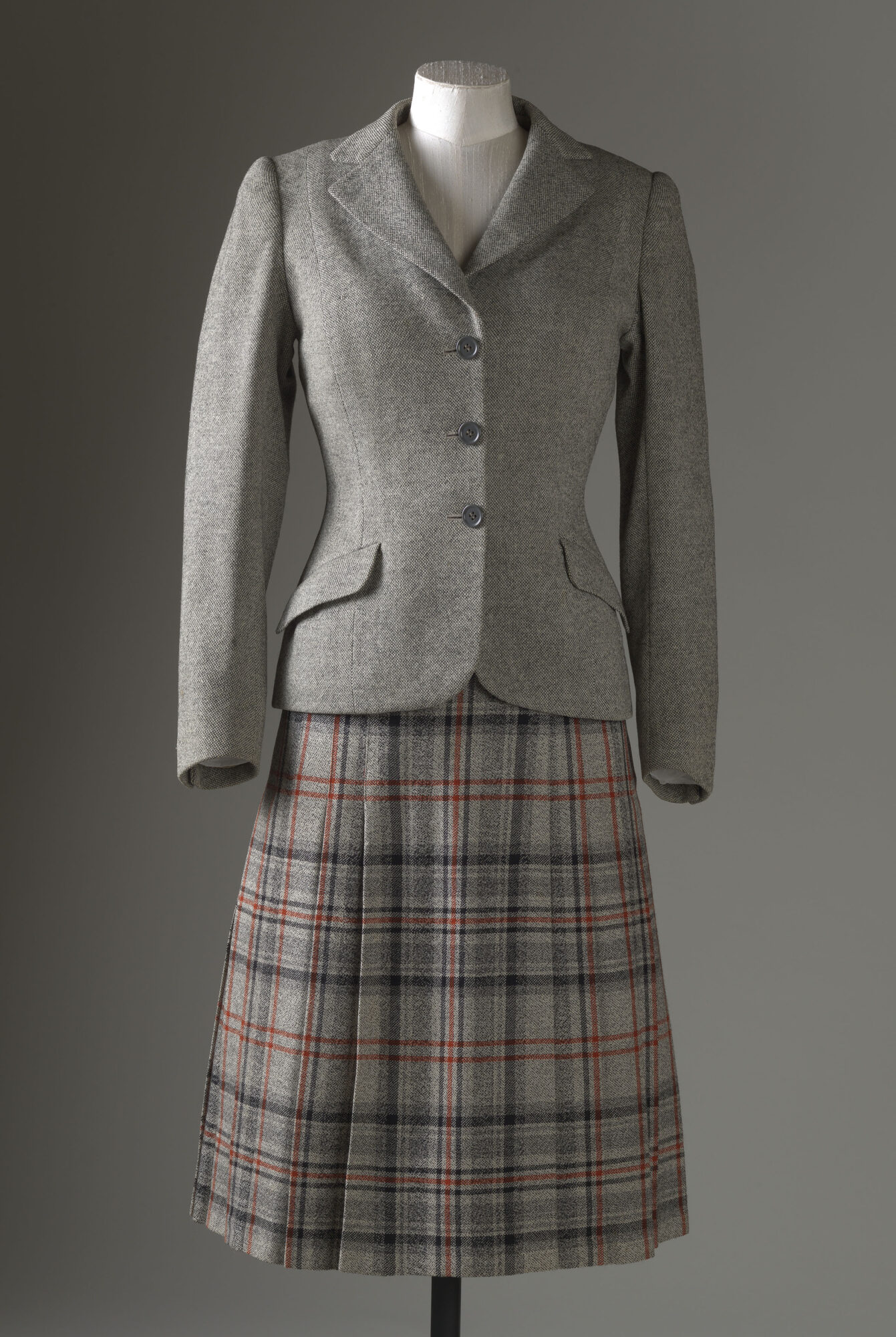 Jordnært: Også noen av hennes mer mer uformelle antrekk får plass i utstillingen: Perfekt skreddersydd tweedjakke og kilt designet av Norman Hartnell på 50-tallet, mens Angela Kelly designet den grønne kåpen på 2010-tallet. Foto: © Royal Collection Enterprises Limited 2025 | Royal Collection Trust. Photographer: Jon Stokes