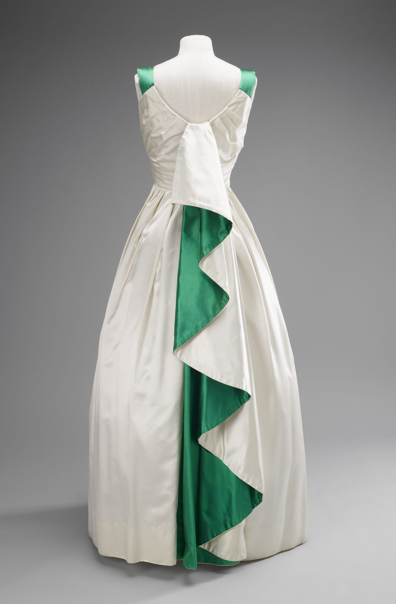Kongelig mote som diplomati: Elizabeth II forsto tidlig klærnes betydning utover det estetiske. Gjennom farger, symboler og detaljer kommuniserte hun respekt og tilhørighet under statsbesøk verden over. Et eksempel er en hvit aftenkjole som Norman Hartnell designet til en statsbankett i Karachi i 1961, med en dramatisk grønn fold som refererte til Pakistans nasjonalfarger. © Royal Collection Enterprises Limited 2025 | Royal Collection Trust