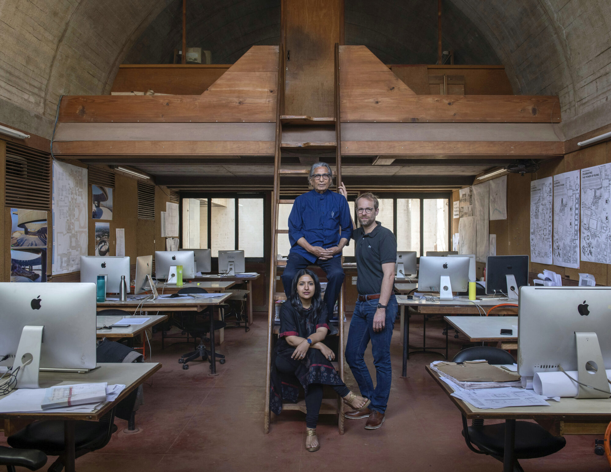 En familie av arkitekter: Balkrishna Doshi sammen med barnebarnet Khushnu Panthaki Hoof og hennes mann Sönke Hoof i 2018. Foto: Vinjay Panjwani.