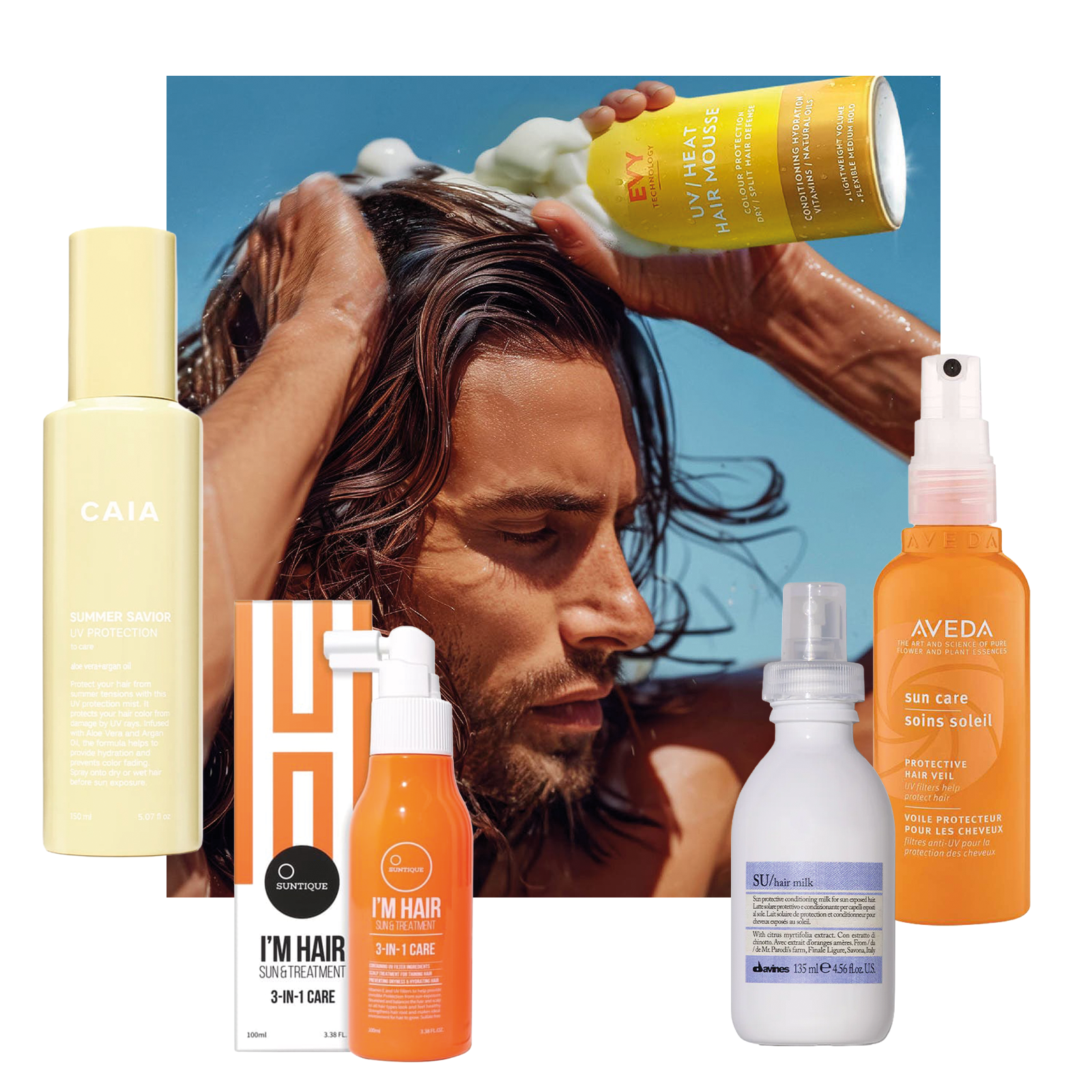 Hårfin beskyttelse: Summer Savior fra Caia, kr 275, er en lett spray som kan brukes i både vått og tørt hår. Bevarer farget hår og virker fuktighetsgivende. Suntique I’m Hair Sun&Treatment, kr 279, er en spray som tilbyr solbeskyttelse både til hår og hodebunn. Hårlokkene på bildet får en god dose med Evy Heat Hair Mousse, kr 219, er et parfymefritt hårskum som fungerer både som et stylingprodukt og som UV- og varmebeskyttelse. Su Hair Milk fra Davines, kr 359, er en beskyttende leave-in spray som gir fuktighet og ivaretar farget hår. Aveda sun care protective hair veil er en UV beskyttelsespray som i tillegg til å beskytte håret fra solen reduserer skade og sørger for at håret ikke tørker ut.