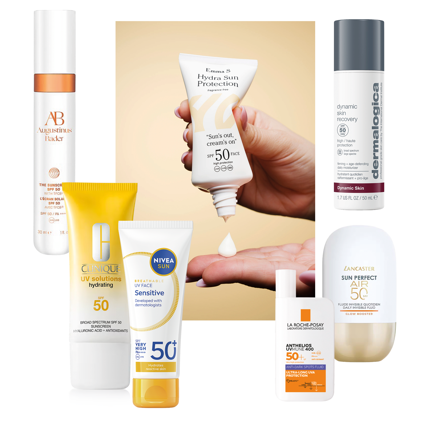 Krem de la krem til ansiktet: Augustinus Bader The Sunscreen, kr 1480, er lett og hurtigabsorberende og gir høy SPF-beskyttelse mot UVA- og UVB-stråler. Påføres som siste steg i hudpleierutinen din. Emma S. Hydra Sun Protection, kr 329, inneholder blant annet hyaluronsyre og vitamin E som gjør at den kan erstatte din vanlige dagkrem under sminke. Dermalogica Dynamic Skin Recovery er en lett fuktighetskrem med bredspektret solfaktor 50 hjelper med å jevne ut hudtonen og forbedre hudens tekstur, samtidig som den reduserer synligheten av fine linjer og rynker. Clinique UV Sollutions Hydrating Sunscreen, kr 360, er en lett solkrem med SPF 50 som beskytter mot UVA- og UVB-stråler og absorberes raskt uten å bli hvit på huden. Nivea UV Face Sensitive, kr 149, er en lett solkrem for ansiktet med SPF som i tillegg til å gi svært høy beskyttelse mot UVB-stråler fukter sensitiv hud og motvirker solallergier. Lancaster Sun Perfect Air 50, kr 550, er en lett solfluid med solfaktor 50 som gir mye fukt. La Roche-Posay Anthelios UVmune Anti-dark Spots er godt egnet for sensitiv hud og hud med tendens til hyperpigmentering.