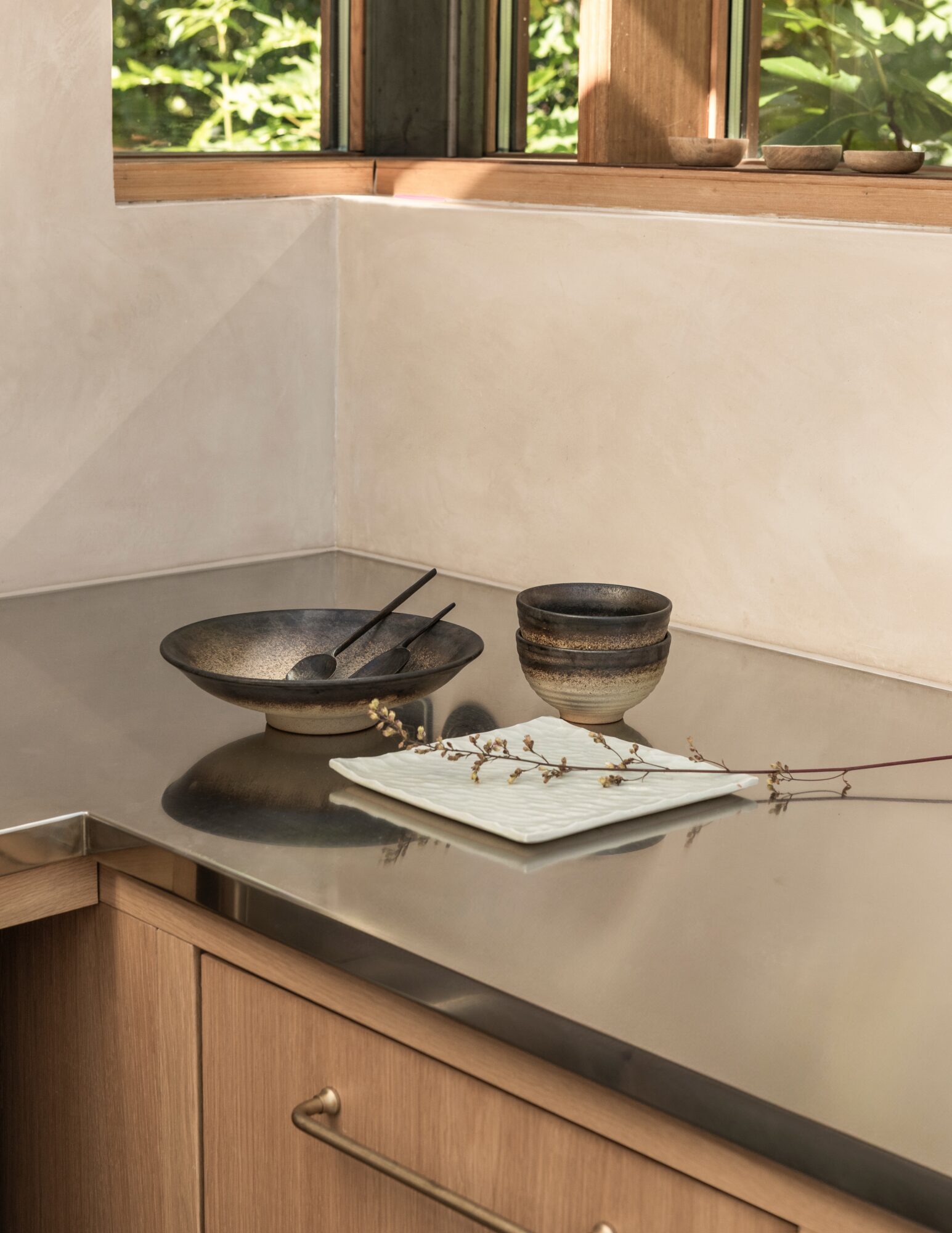 Det vakre kjøkkenet inngår naturlig i arkitekturen – tilpasset både stedet og måten det brukes på. Samtidig er funksjonen tydelig til stede. Bak det dempede uttrykket skjuler det seg et fullt utstyrt kjøkken, med samme kapasitet som et lite restaurantkjøkken.
