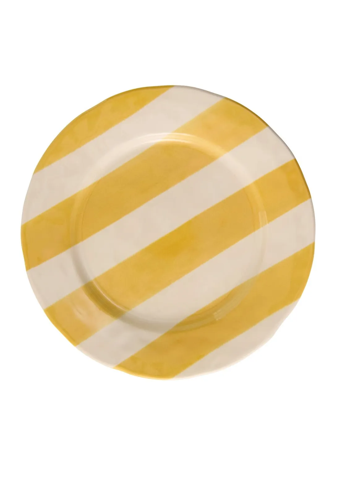 Striper: Tallerkenserien Verona fra Rusta i robust stengods er håndlaget slik at hvert eksemplar er unikt. Tallerken Ø 28 cm i gult eller grønt, kr 79,90, asjett Ø 22 cm, 5 cm i gult eller grønt, kr 59,90. Det er utrolig fint å mikse de to fargene og mønstrene.