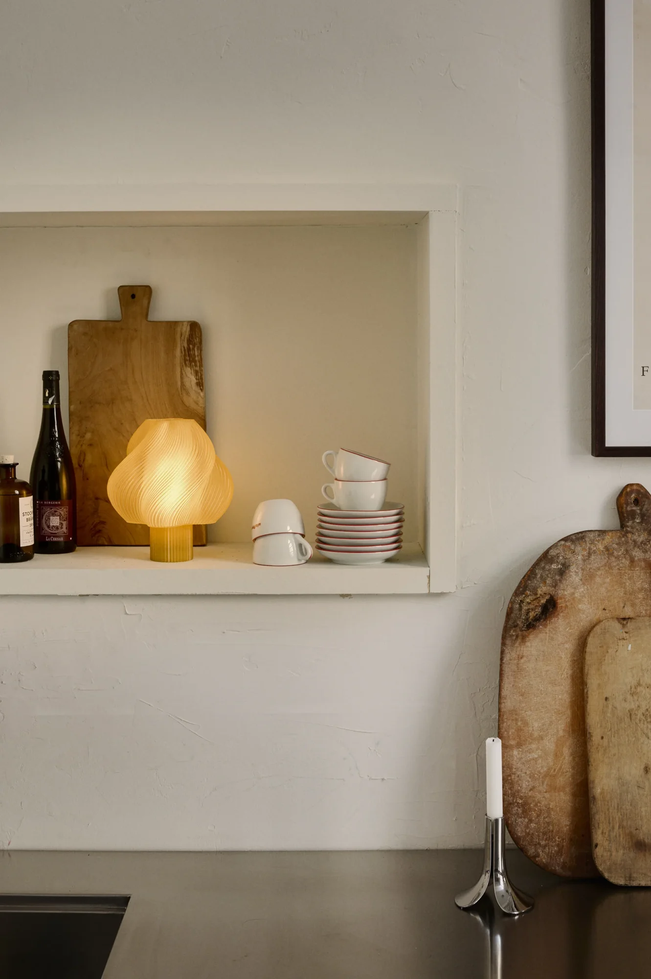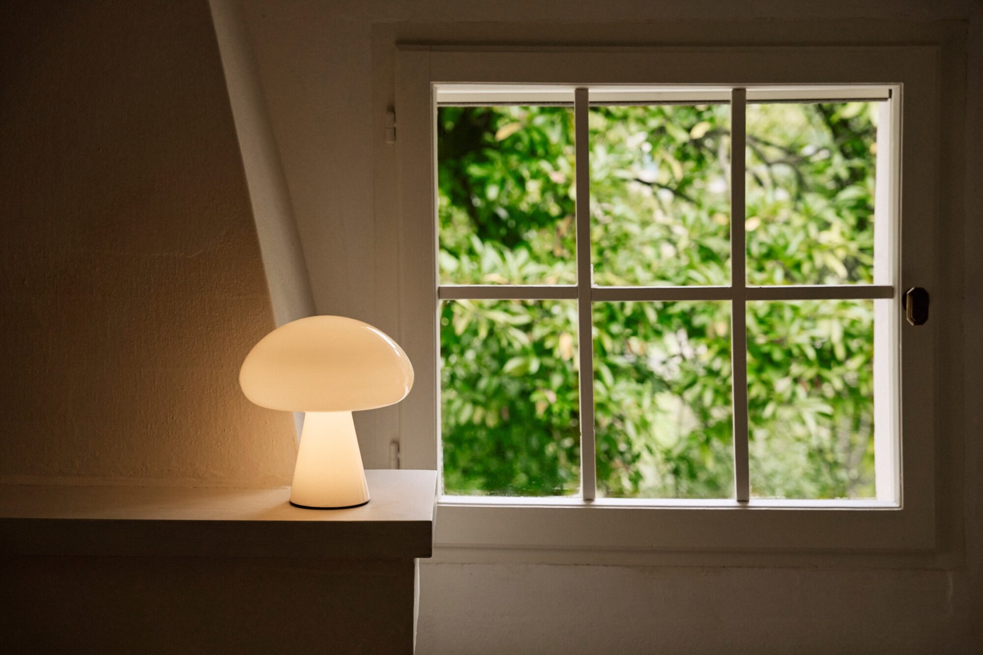 Munnblåst: Gubis soppformede LED-lampe Obello i munnblåst glass fås i tre milde nyanser, inkludert Pearl White som lyser opp sine omgivelser og er rustet for utesesongen med IP44, kr 3499.