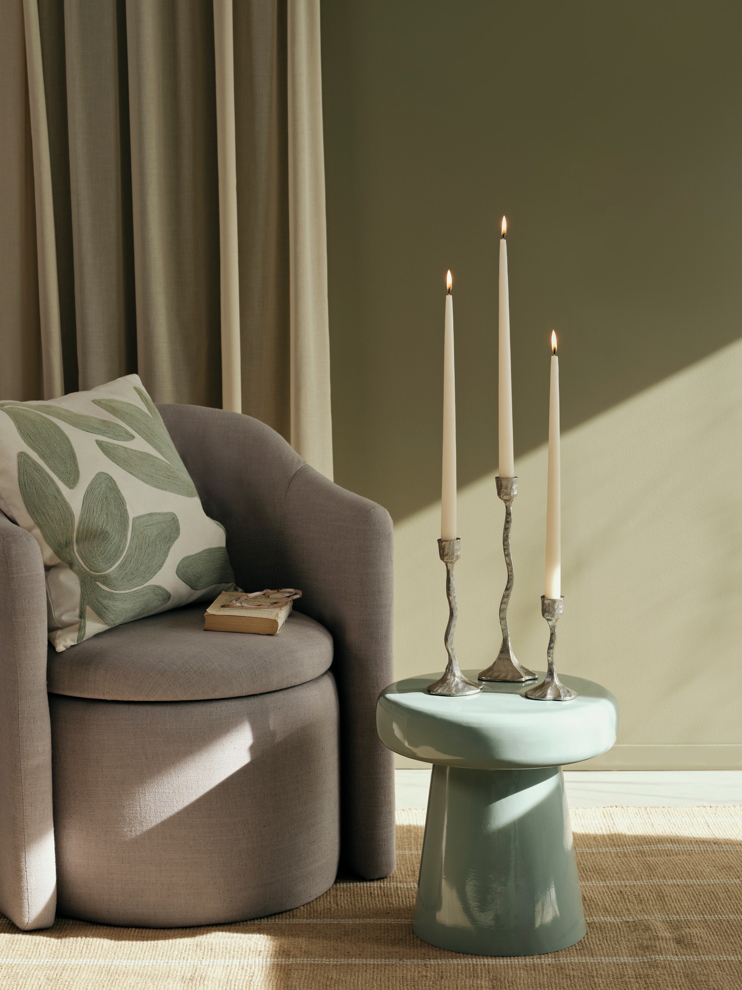Godt opplyst: Amy lysestaker i aluminium er blant vårnyhetene til Broste Copenhagen, fra kr 299. Caret MF1 bærbar lampe fra &Tradition i den nye fargen Forest, kr 2140, christiania-belysning.no.