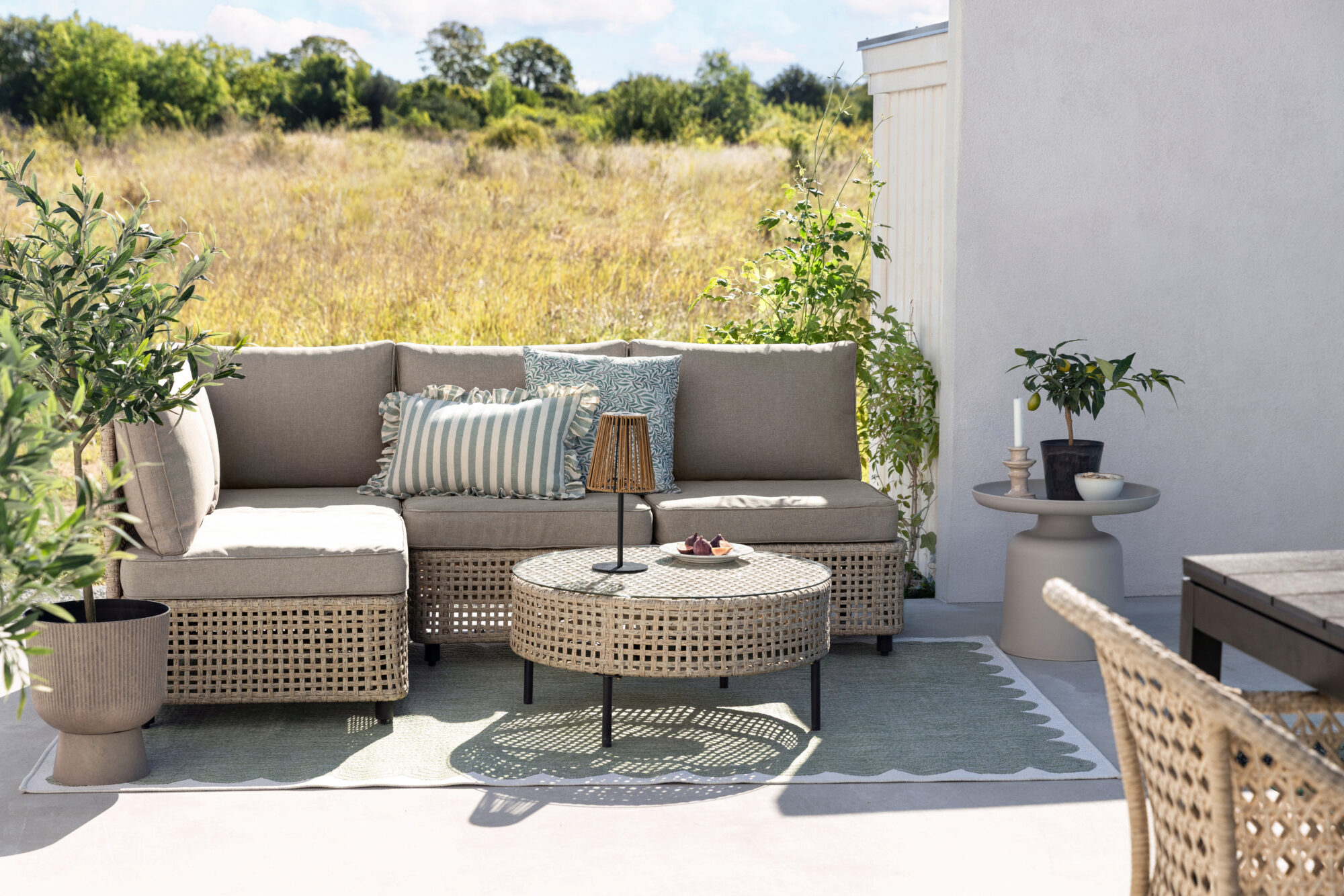 På uteplassen: Loungesett i 5 deler, i håndflettet kunstrotting med vannavvisende puter, kr 6695, Rusta.