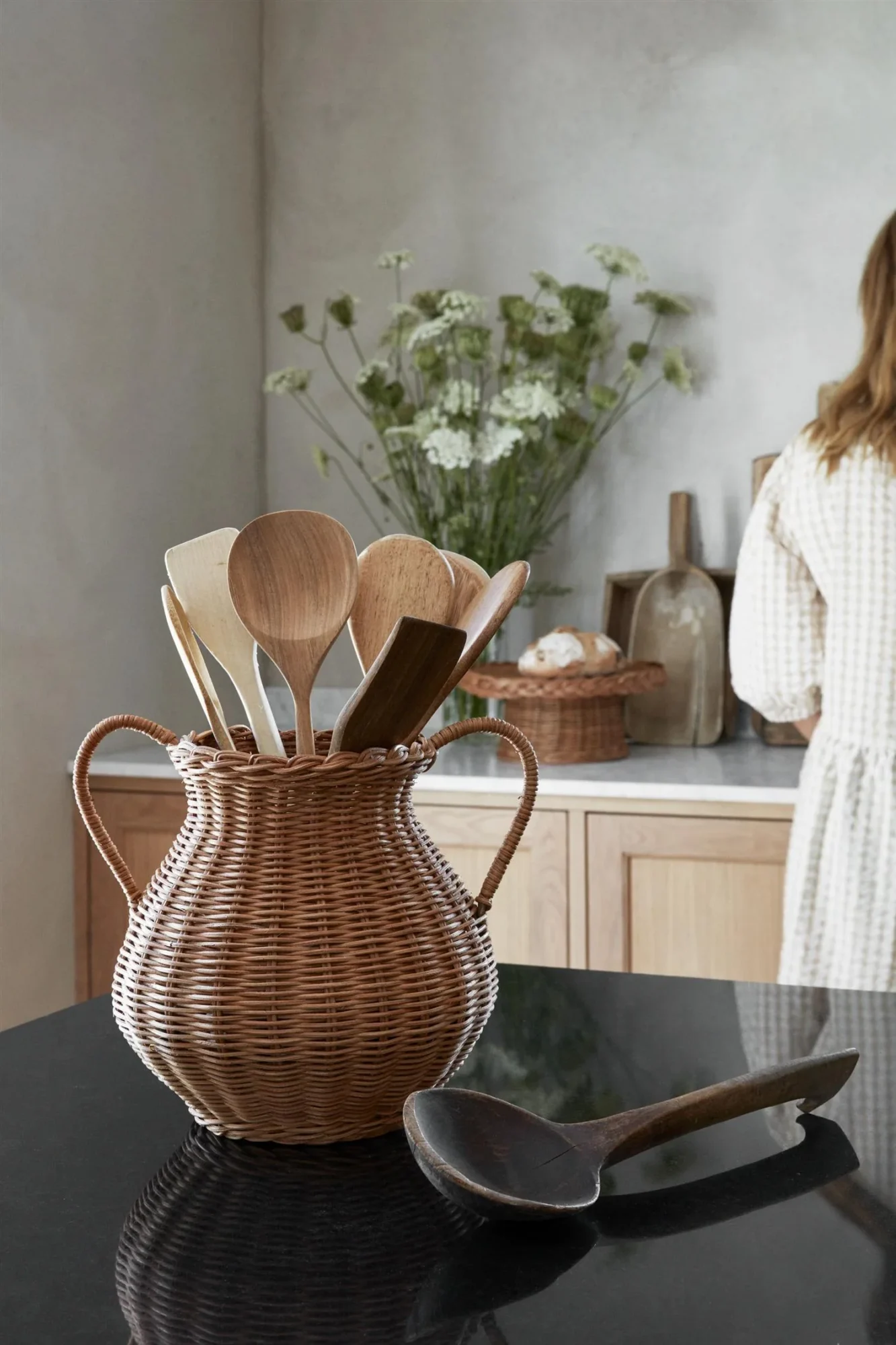 Til kjøkkenet: Princess vase i naturlig rotting, Ø 28 x h 24 cm, kr 899, og Cake Stand fat med stett og flettekant i naturlig rotting, Ø 31 x h 14 cm, kr 699, Bolina.