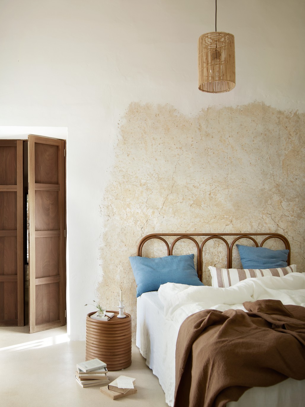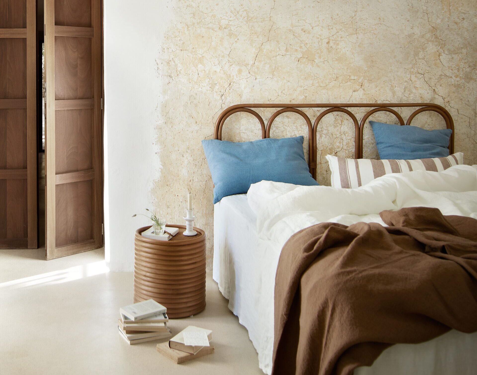 På soverommet: Manodrum sidebord i mandola-rotting, h 42 cm, ca. kr 3700, og Manobed sengegavl i mandola-rotting, b 160 x h 110 cm, ca. kr 3400, Tine K Home.