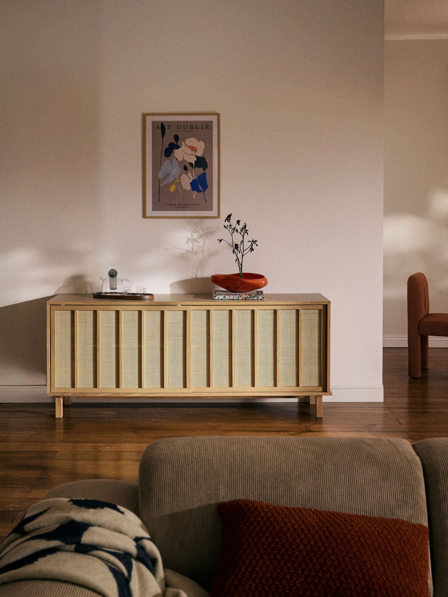 Harmonisk ro: Echo skjenk med fronter i rotting og ramme av FSC-sertifisert treverk/eik, l 180 x b b 45 x h 75 cm, kr 12 399, westwing.no. Finnes også i mørk eik.