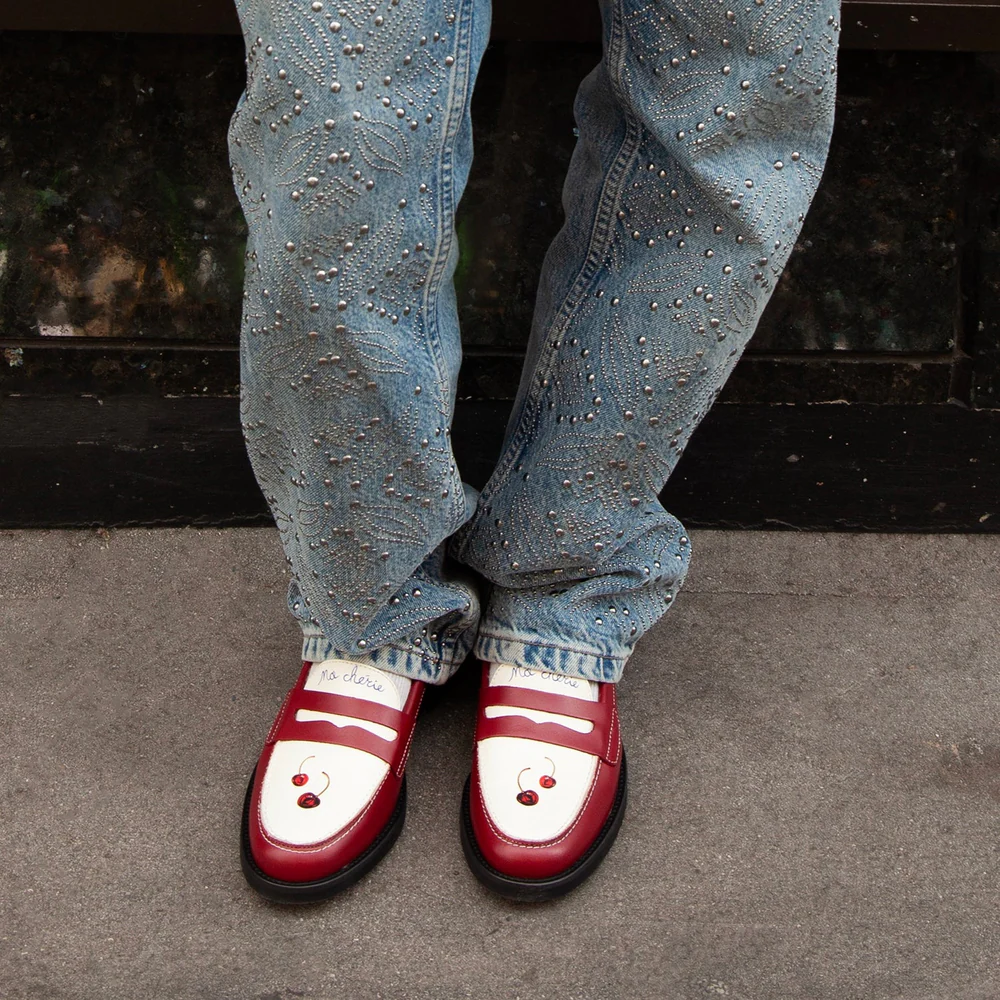 Kirsebærdryss: Røde og hvite loafers med kirsebær fra Londonbaserte Duke+Dexter, ca kr 3874. Finnes i mange herlige farger og varianter.