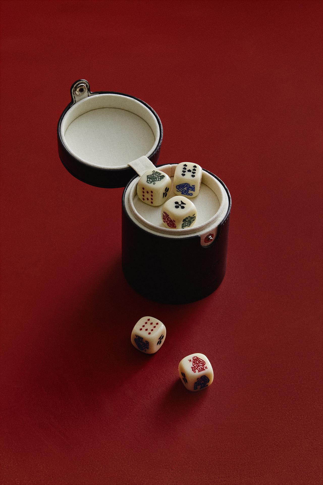 Pokerfjes? Et av verdens mest populære spill er poker, og dette settet fra Zara Home inneholder fem terninger og en rund boks til å oppbevare dem i, kr 269.