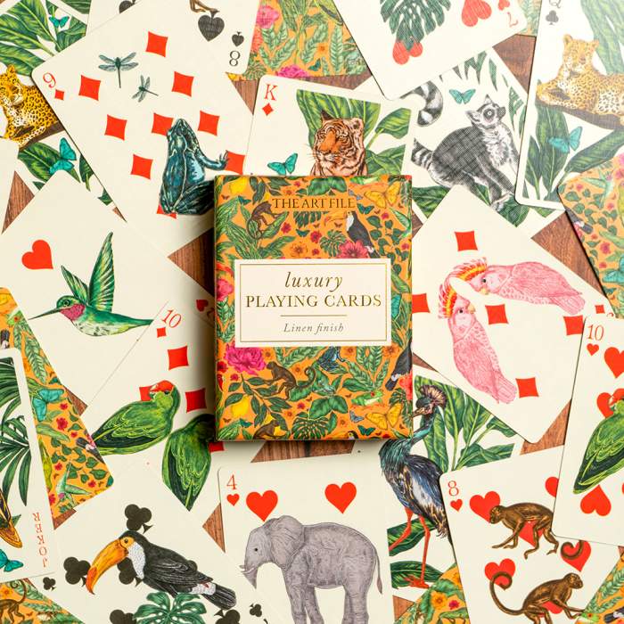 Hold stilen: Kortstokken Soleil fra The Art File, kr 149, er så pen å se på at vi gjerne blir sittende og nyte synet. Har vi spilt Mah Jong tidligere? Neida, men vi prøver gjerne! Reverra Mahjong-spill, kr 2995, fra Printworks.