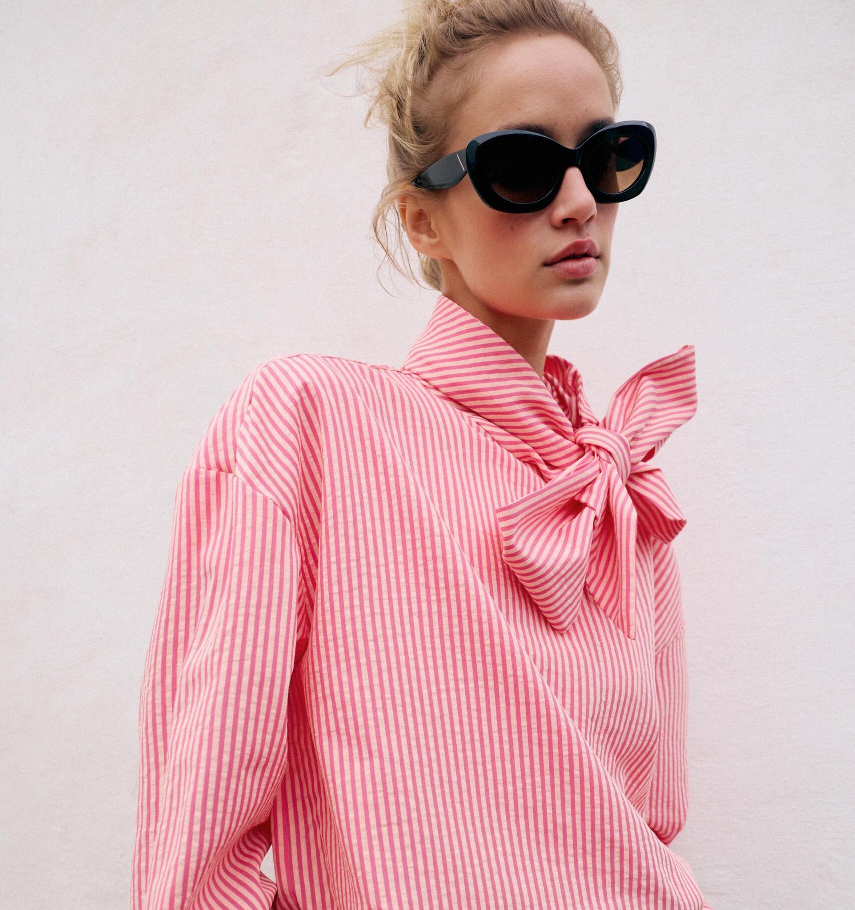 Med striper: Skjortebluse i bomull/polyester med høy hals og sløyfe, kr 499, zara.com.