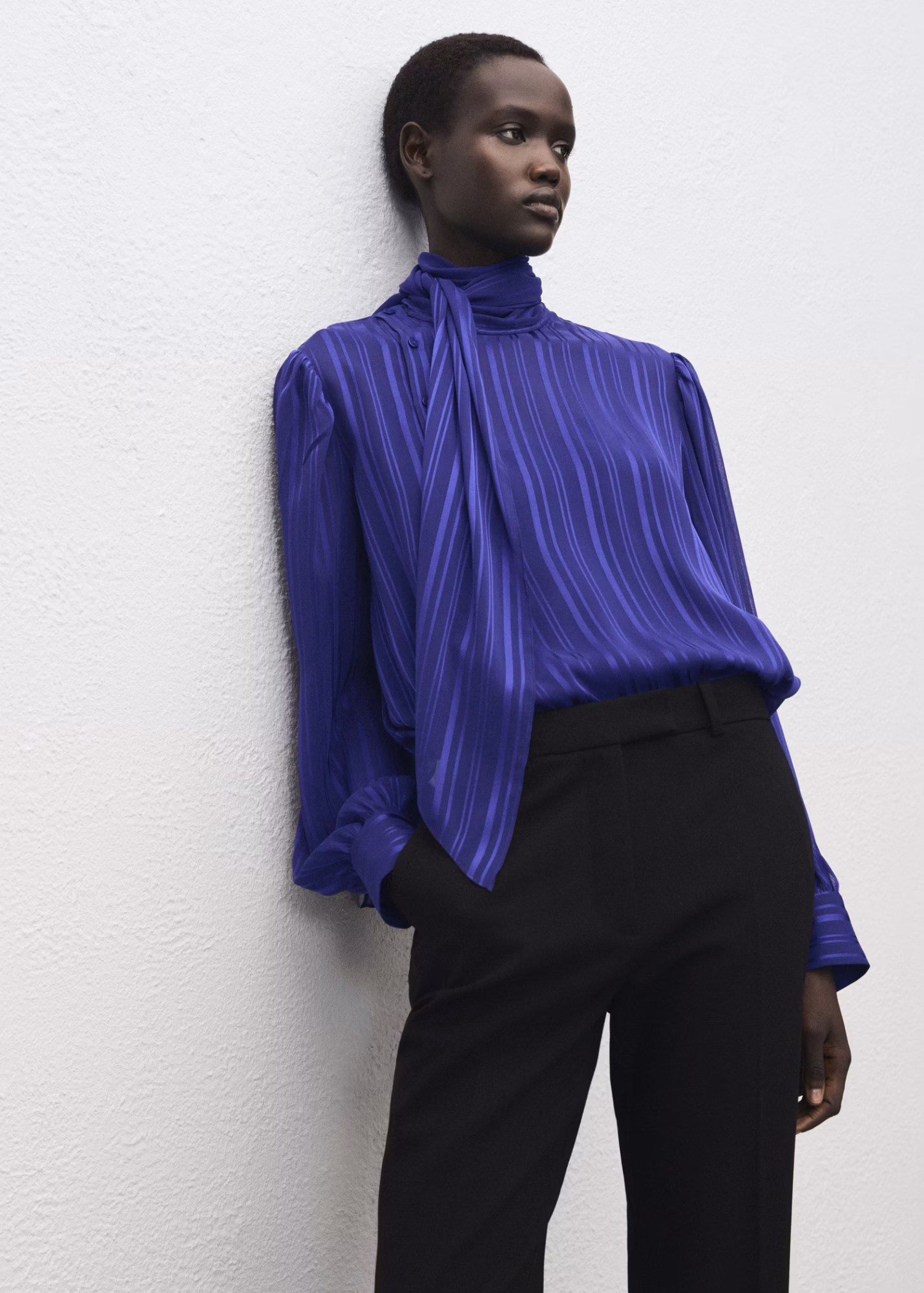 Med striper og puffermer: Bluse med skjerf i polyester, kr 499, mango.com.