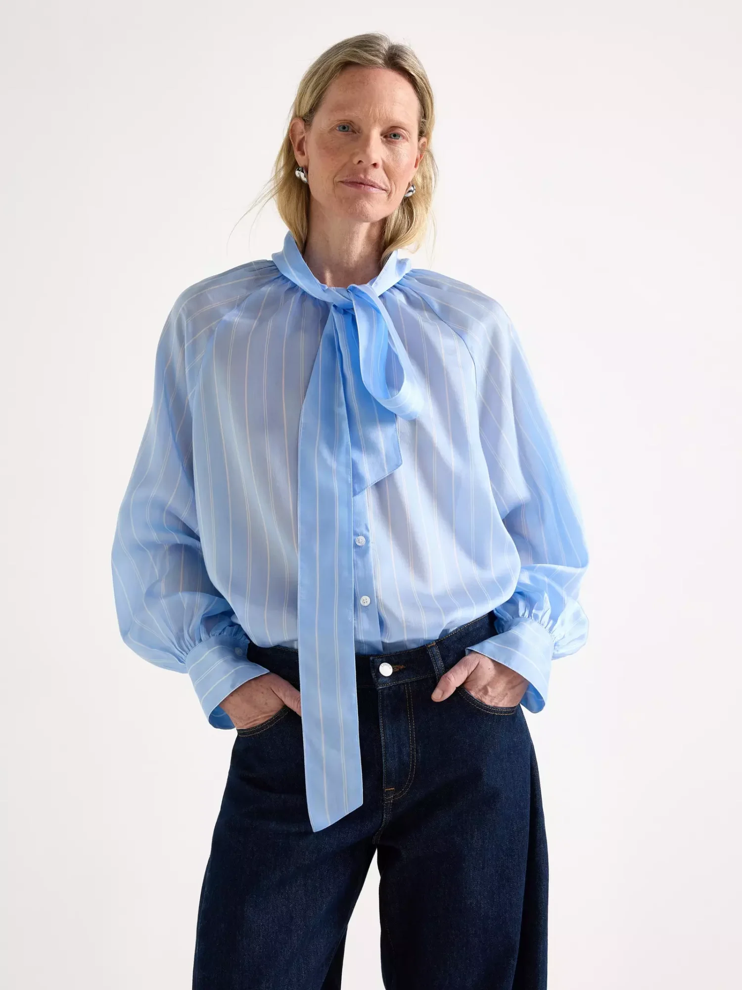 Kortermet med puffermer: Blå silkebluse med mønster og sløyfe, kr 1390, oghvit silkebluse med mønster og sløyfe, kr 1390, &Other Stories.