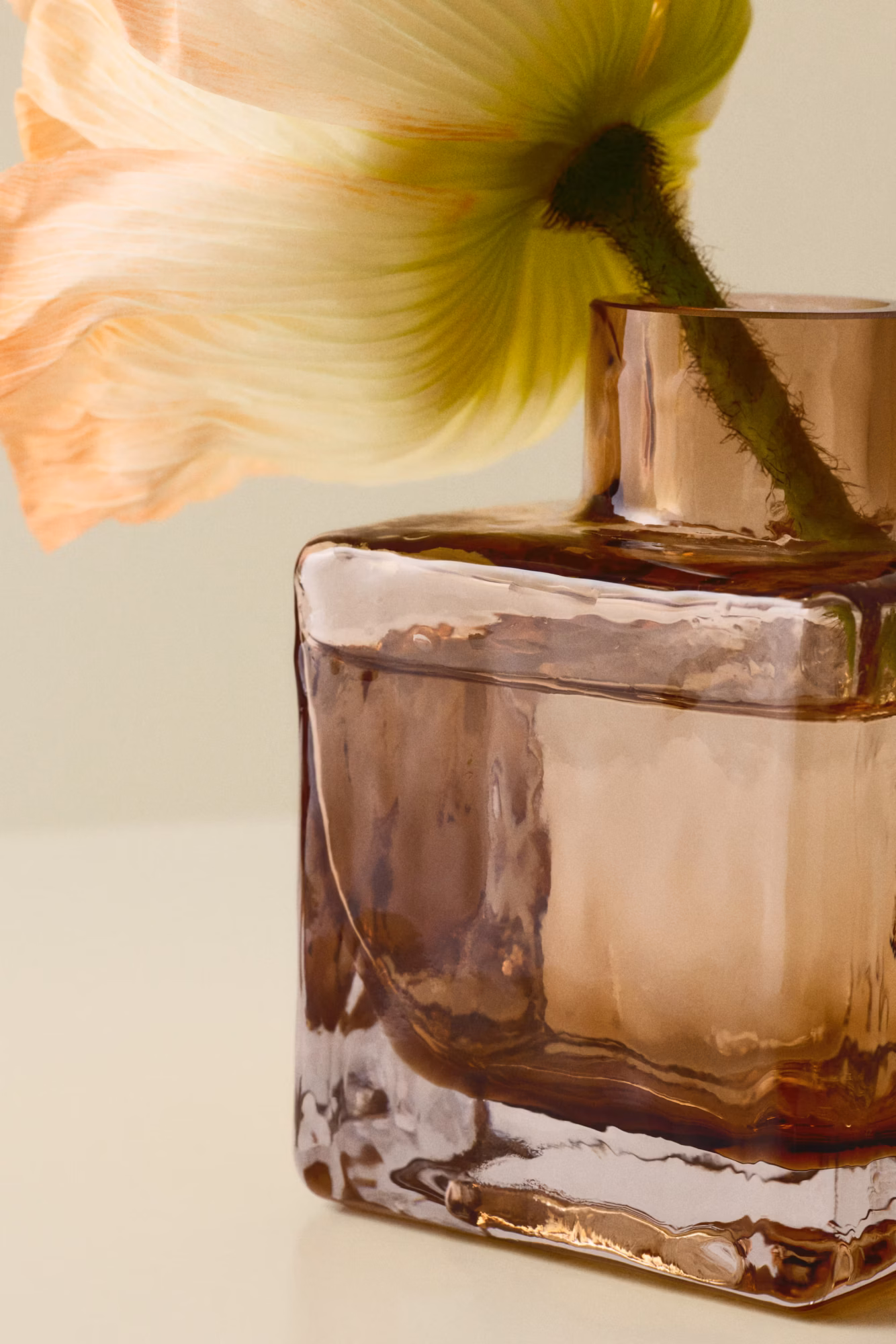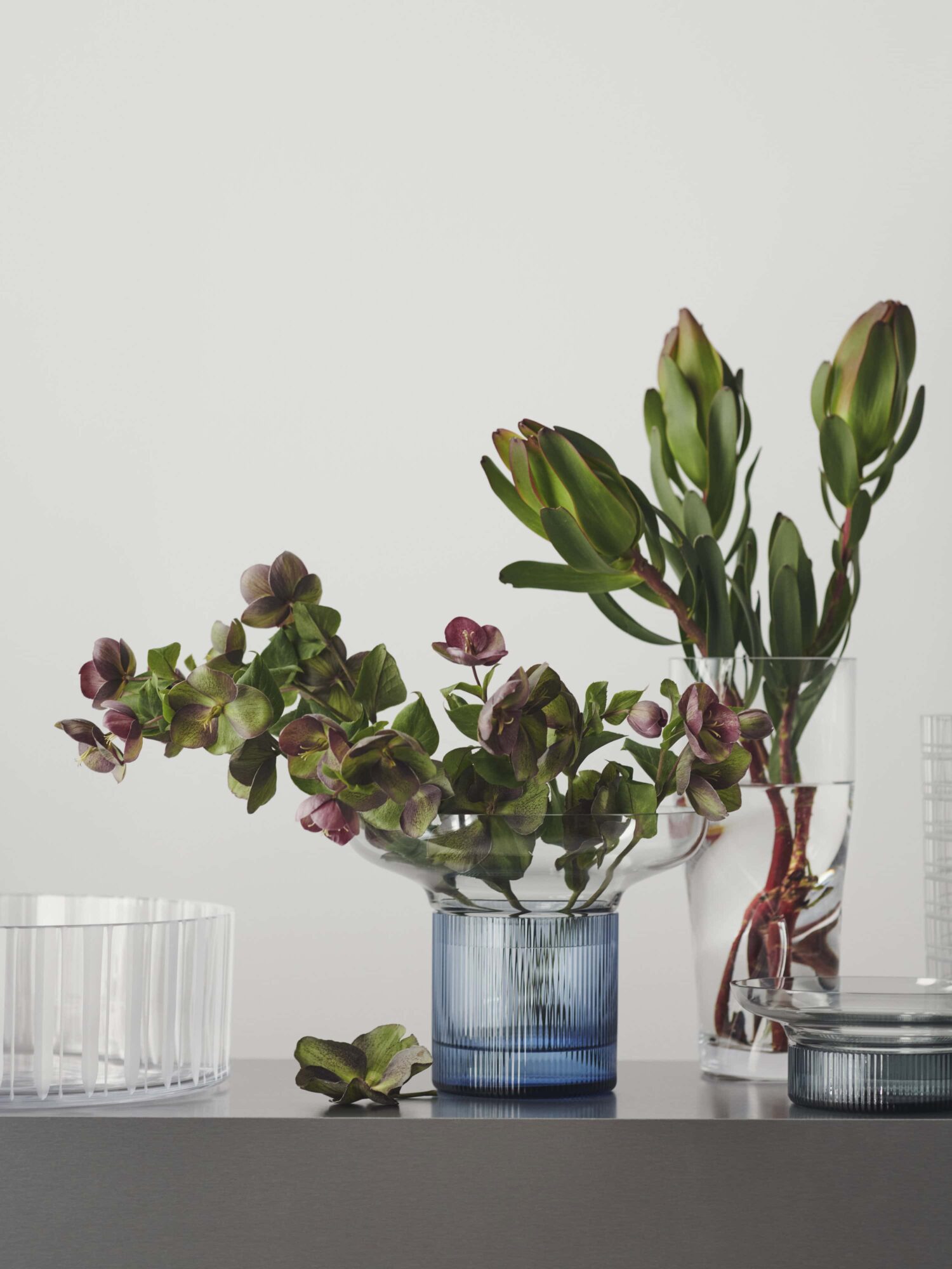 Geometrisk: Orrefors har et rikholdig sortiment med vaser vi «vilhøver» – blant annet den modernistiske Ensemble i klart og blåfarget glass, kr 920, orrefors.com. Strukturmønstert vase i glass i fargen lys brun, i forskjellige størrelser og høyder, fra kr 89 til 299, hm.com.