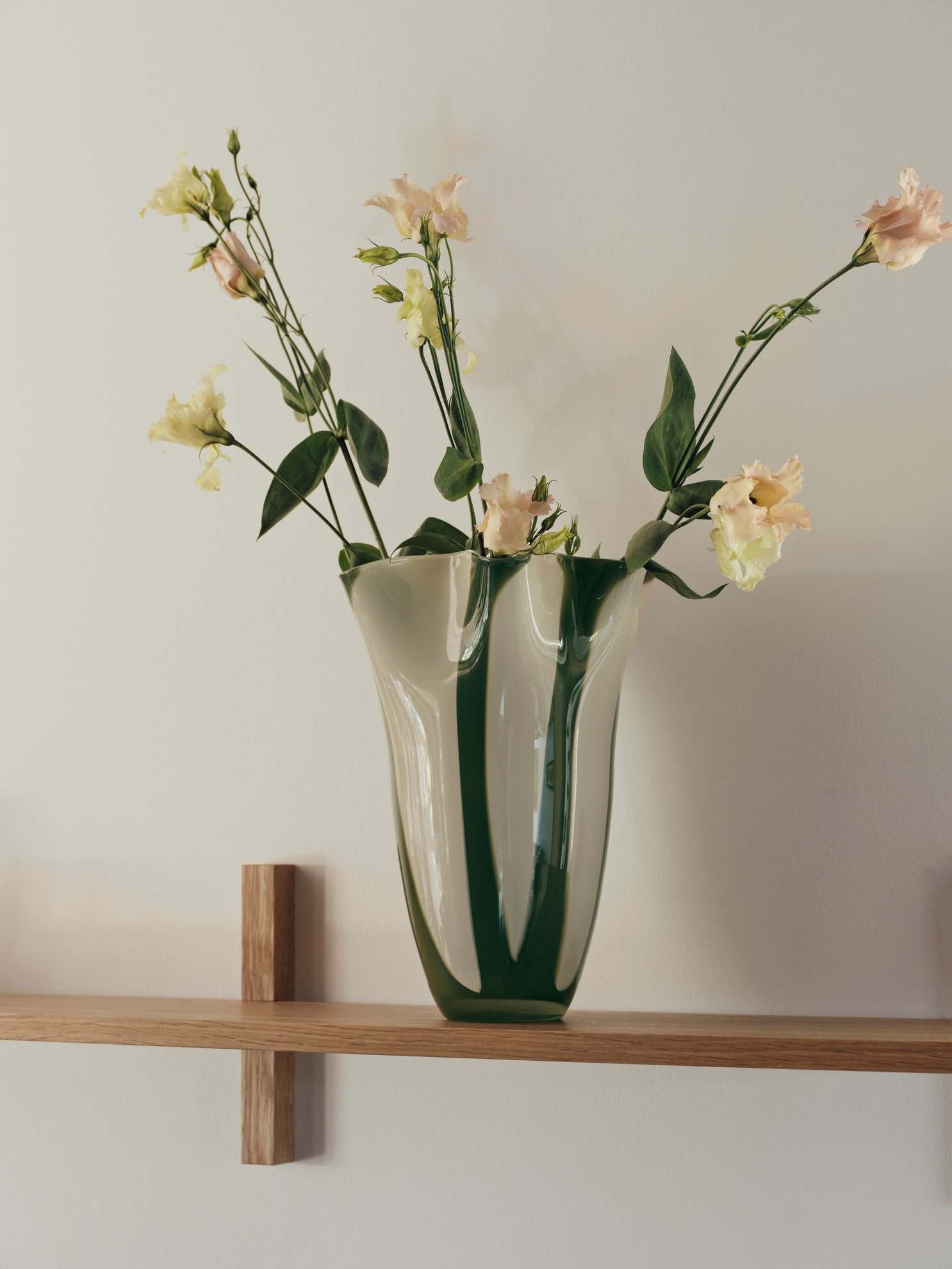 Munnblåst glass: Liva glassvase i fargen Hunter Green/White Cream, h 31,5 cm, kr 599, Broste Copenhagen. Finnes også med leopardmønster. Med en vri: Odette vase i glasert keramikk med spiral form, i fargen Hunter Green, h 32 cm, kr 535, brostecopenhagen.com. Finnes også i hvit.