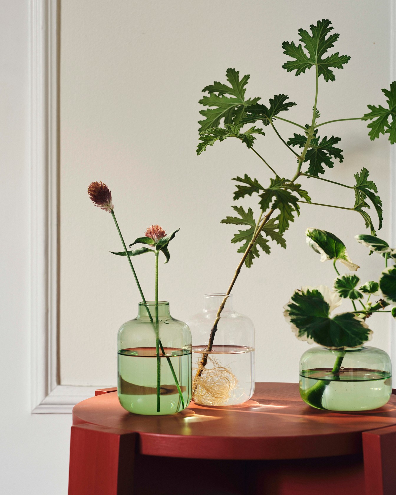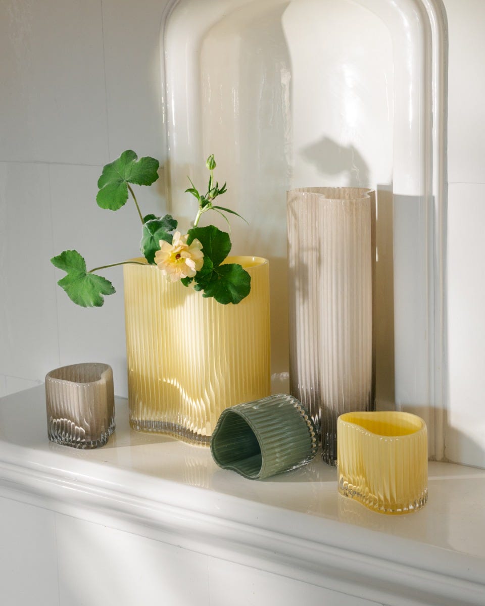 Med riller: Gul glassvase, håndlaget i soda-limeglass, som tåler oppvaskmaskin, h 21,5 cm, kr 299, og høy beige glassvase med riller, h 30 cm, kr 399, Granit. Til stiklinger og enkle kvister: Stiklingsvase i grønt og klart borosilikatglass, h 11 cm, kr 59, og liten grønn vase, b 9 x h 7 cm, kr 69, granit.com.