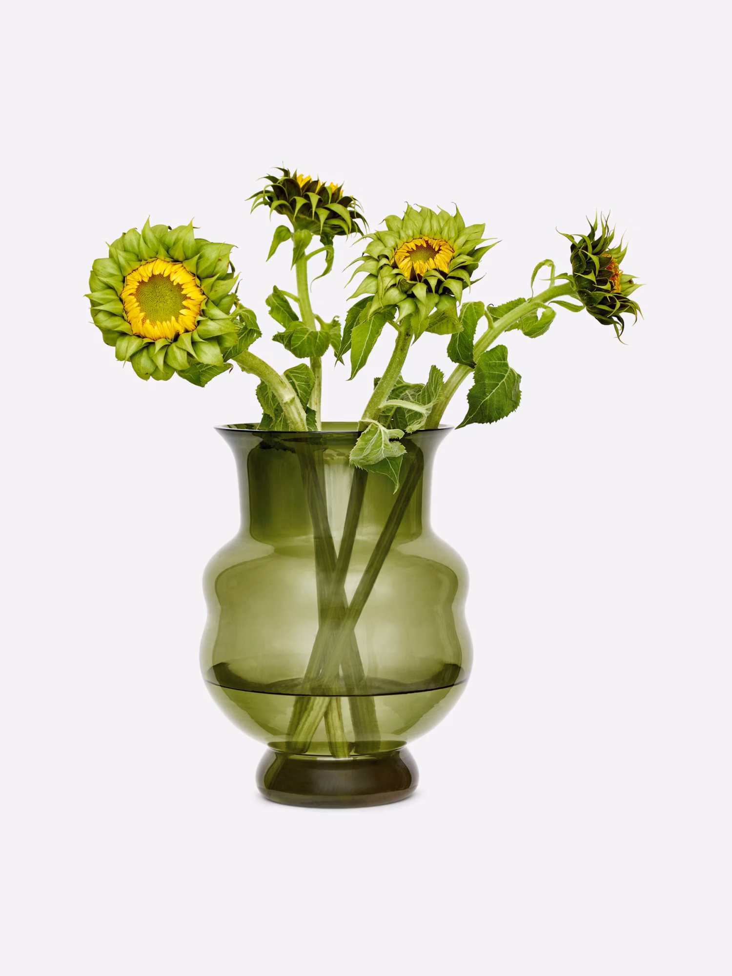 Farget glass: Grønn glassvase i munnblåst soda-lime glass som tåler oppvaskmaskin, Ø 15 x h 15 cm, kr 199, granit.com.